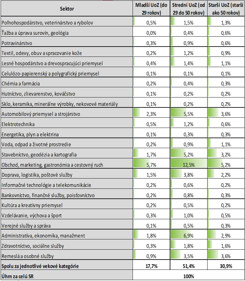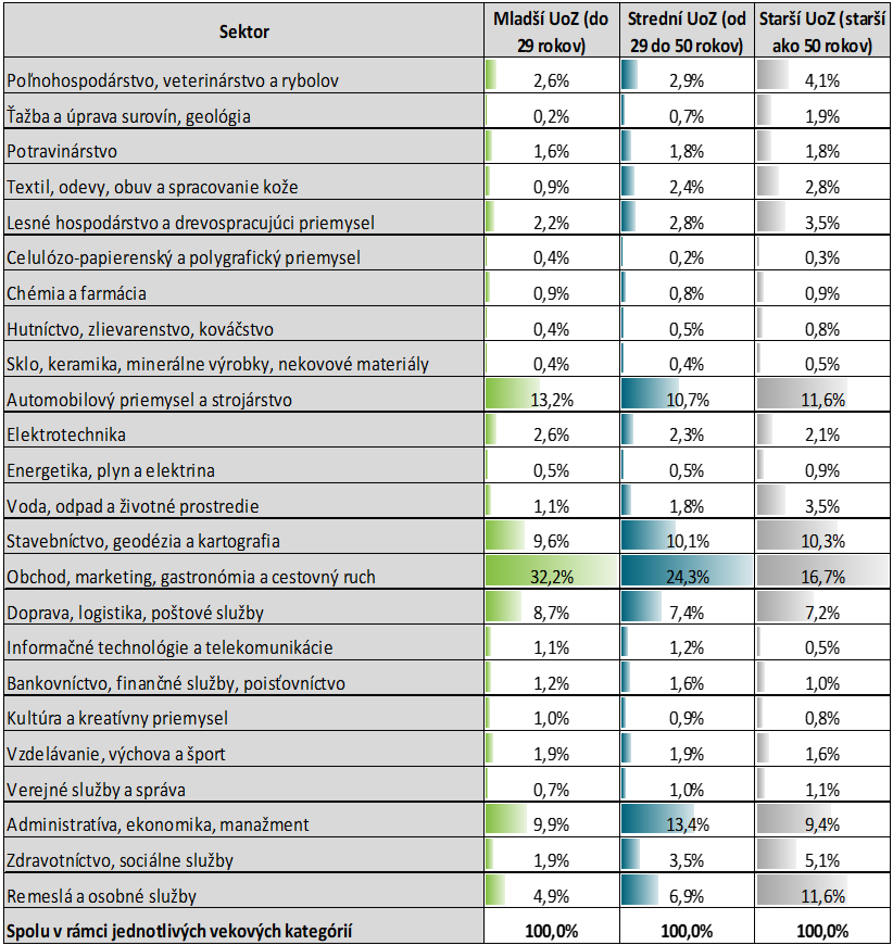 Celkový počet sektorovo špecifických UoZ v SR k 31. 12. 2020 predstavoval približne 160 tis. osôb. V tomto počte UoZ metodicky nie sú zahrnuté tie osoby v evidencii UoZ, ktoré nie je možné klasifikačne špecifikovať podľa 24 sektorov SRI, pretože bezprostredne pred zaradením do evidencie UoZ nemali uvedené žiadne vykonávané zamestnanie, a to najmä dlhodobo nezamestnaní, absolventi škôl, ktorí nezískali prvé platené zamestnanie, iní pomocní pracovníci inde neuvedení a pod. Z tohto počtu sektorovo špecifických UoZ, t. j. z približne 160 tis. osôb, bolo cca 17,7 % mladších do 29 rokov, cca 51,4 % v strednom veku od 29 do 50 rokov a cca 30,9 % starších ako 50 rokov. Prehľad o ich distribúcii v sektorovej štruktúre poskytujú nasledujúce súhrnné tabuľky.