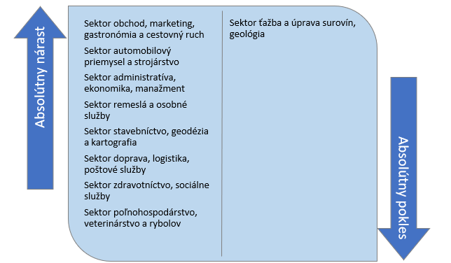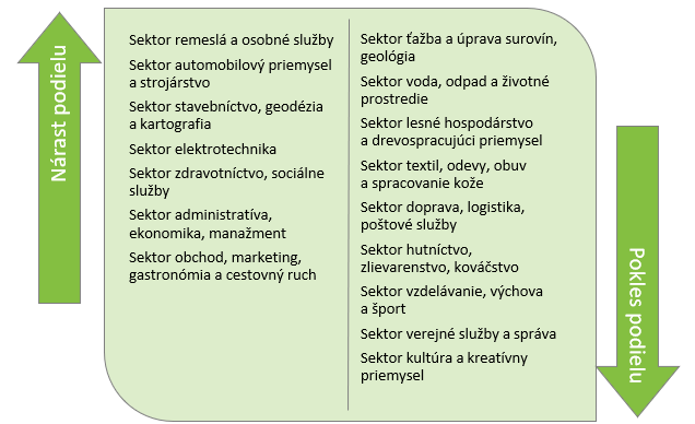Prehľadné informácie o zmene v sledovanom období, ako aj o sektoroch so stabilizovaným podielom v štruktúre sektorovo špecifických UoZ, prezentujú nasledujúce sumarizačné infografiky.