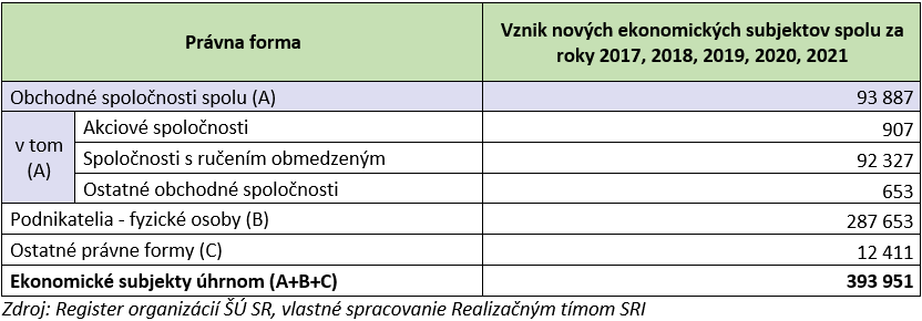 Vyššie uvedených päť sektorov zahrňovalo približne 71 % z celkového počtu cca 394 tisíc sektorovo špecifických ekonomických subjektov, ktoré vznikli v rokoch 2017 až 2021. Súhrnné informácie o vzniku sektorovo špecifických ekonomických subjektov prezentuje nasledujúca tabuľka.