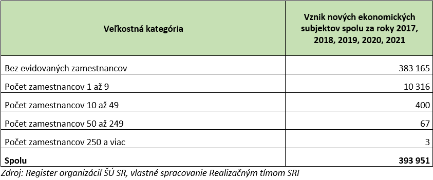 Ekonomické subjekty, ktoré začali pôsobiť v sledovanom časovom intervale, boli prevažne bez evidovaných zamestnancov, pričom kumulatívne v období rokov 2017 až 2021 v tejto veľkostnej kategórii začalo svoju činnosť približne 383 tisíc ekonomických subjektov. Približne 10 tisíc ekonomických subjektov vzniklo vo veľkostnej kategórii 1 až 9 zamestnancov, v kategórii 10 až 49 zamestnancov vzniklo 400 nových ekonomických subjektov a v kategórii 50 až 249 zamestnancov to bolo cca 70 nových subjektov. V najväčšej veľkostnej kategórii, t. j. 250 a viac zamestnancov, vznikli celkovo v sektorovej štruktúre SRI tri ekonomické subjekty.