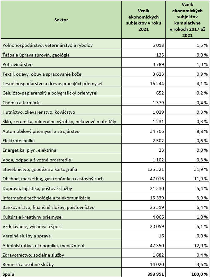 Najvýraznejšia dynamika vzniku ekonomických subjektov bola v rokoch 2017 až 2021 v sektore stavebníctvo, geodézia a kartografia, kde v sledovanom časovom úseku vzniklo približne 125 tisíc ekonomických subjektov, t. j. cca 32 % z celkového počtu ekonomických subjektov, ktoré v tom čase vznikli v sektorovej štruktúre SRI. Naopak, najmenej (približne 20) novovzniknutých ekonomických subjektov bolo zaznamenané v sektoroch: