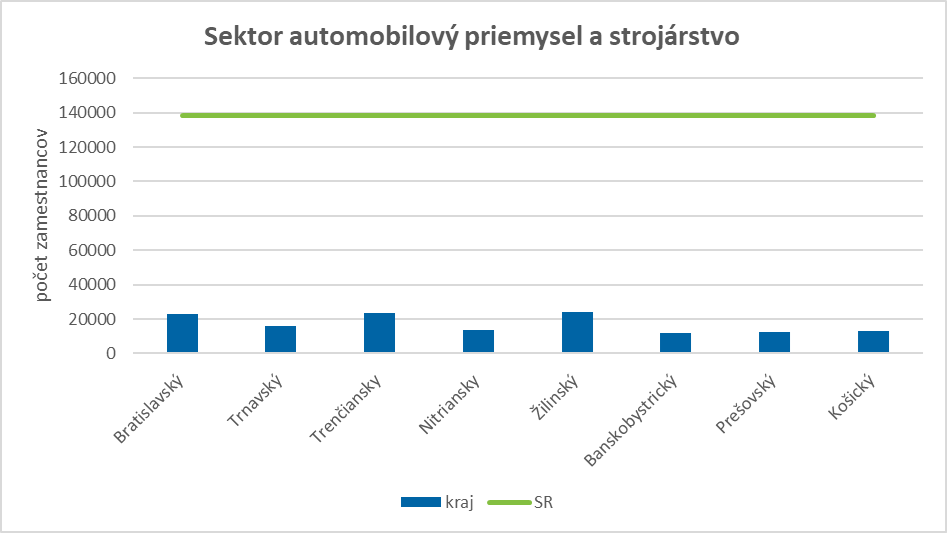Sektor automobilový priemysel a strojárstvo bol charakteristický približne 17 %-ným (viac ako 24 000 osôb) zastúpením Žilinského kraja na celkovom počte sektorovo špecifických zamestnancov v SR. Podobne, približne 16 % sektorovo špecifických pracovných príležitostí sa využilo v Bratislavskom kraji, ako aj v Trenčianskom kraji. Medzi regiónmi najnižší podiel sektorovo špecifických zamestnancov vykázal k 31. 12. 2021 Banskobystrický kraj, a to cca 9 % z úhrnného počtu sektorovo špecifických zamestnancov.