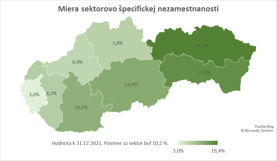 Miera sektorovo špecifickej nezamestnanosti bola v štyroch krajoch SR vyššia, ako bola jej celoštátna priemerná hodnota v rámci sektora, pričom situáciu v krajoch ovplyvnila taktiež návratová mobilita osôb, ktoré boli z práce uvoľnené v inom regióne, vrátane zahraničia. V sektore automobilový priemysel a strojárstvo bola najvýraznejšia miera sektorovo špecifickej nezamestnanosti k 31. 12. 2021 zaznamenaná v Prešovskom kraji, kde dosiahla približne 19 %. V opačnom spektre vynikal Bratislavský kraj, kde bola zaznamenaná miera sektorovo špecifickej nezamestnanosti iba na úrovni 3 %.