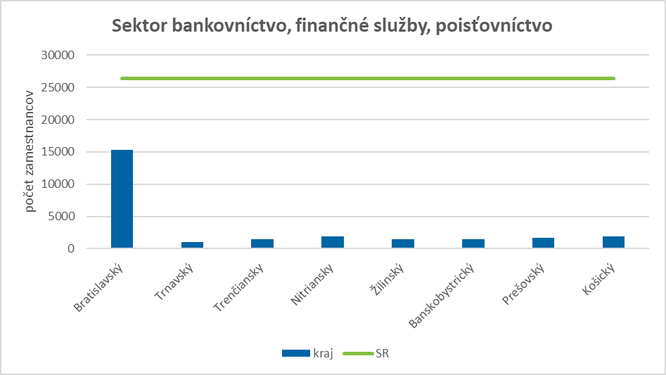 Sektor bankovníctvo, finančné služby, poisťovníctvo bol charakteristický dominantným, a to približne 60 %-ným (viac ako 15 000 osôb) zastúpením Bratislavského kraja na celkovom počte sektorovo špecifických zamestnancov v SR. Medzi regiónmi najnižší podiel sektorovo špecifických zamestnancov vykázal k 31. 12. 2021 Trnavský kraj, a to cca 4 % z úhrnného počtu sektorovo špecifických zamestnancov v bankovníctve, finančných službách, poisťovníctve.