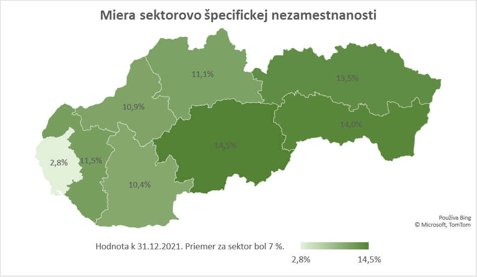 Bratislavský kraj, ktorý alokoval väčšinu sektorovo špecifických pracovných činností v bankovníctve, finančných službách, poisťovníctve, determinoval aj mieru sektorovo špecifickej nezamestnanosti v SR. V Bratislavskom kraji bola k 31. 12. 2021 zaznamenaná najnižšia hodnota miery sektorovo špecifickej nezamestnanosti, a to na úrovni menej ako 3 %. Ďalšie kraje zaznamenali vyššie hodnoty, ako bol celoštátny priemer v rámci sektora (cca 7 %), pričom situáciu v krajoch ovplyvnila taktiež návratová mobilita osôb, ktoré boli z práce uvoľnené v inom regióne, vrátane zahraničia. Najvýraznejšia miera sektorovo špecifickej nezamestnanosti bola k 31. 12. 2021 zaznamenaná v Banskobystrickom kraji, kde dosiahla necelých 15 %. Približne 14 % bola miera sektorovo špecifickej nezamestnanosti v Košickom, resp. Prešovskom kraji.