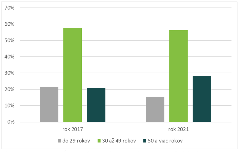 Podielovo najvýraznejšou skupinou zamestnancov v sektore bankovníctvo, finančné služby, poisťovníctvo za rok 2021 boli zamestnanci vo veku 30 až 49 rokov. Ich podiel na celkovom počte sektorovo špecifických zamestnancov predstavoval cca 56,4 %, čo oproti roku 2017 predstavovalo zníženie o cca 1,2 p. b. Druhá najväčšia skupina zamestnancov tohto sektora bola vo vekovej skupine 50 a viac rokov, ich podiel bol rastúci a v roku 2021 predstavoval 28,2 %. Podiel najmladšej skupiny zamestnancov, t. j. do 29 rokov, bol najnižší. Zníženie medzi rokmi 2017 a 2021 dosiahlo 6,1 p. b., a to na konečných 15,4 %.