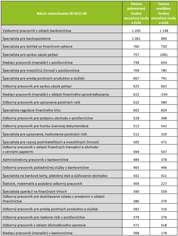 Z hľadiska zmeny priemernej hrubej mesačnej mzdy v peňažných jednotkách, t. j. v EUR, bola v rozmedzí rokov 2017 a 2021 spomedzi sektorovo špecifických zamestnaní identifikovaná najvyššia zmena na úrovni 1 205 EUR v zamestnaní Výskumný pracovník v oblasti bankovníctva. Druhé najvyššie zvýšenie miezd v sektore bankovníctvo, finančné služby, poisťovníctvo bolo medzi rokmi 2017 a 2021 zaznamenané v prípade zamestnania Špecialista pre bankopoistenie, kde príslušný nárast predstavoval 1 061 EUR. Na treťom mieste boli zamestnanci evidovaní v zamestnaní Špecialista pre dohľad vo finančnom sektore, a to so zvýšením mzdy v priemere o 760 EUR. Výrazné zvýšenie miezd v rámci sektora bolo aj pri zamestnaniach Špecialista pre správu zásob peňazí (o 757 EUR) a Riadiaci pracovník (manažér) v poisťovníctve (o 748 EUR).