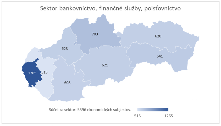 V priebehu ukončeného kalendárneho roku 2021 vzniklo v sektore bankovníctvo, finančné služby, poisťovníctvo v rámci celej SR približne 5 600 ekonomických subjektov. Rozhodnutie o založení nového subjektu bolo koncentrované najmä v rámci Bratislavského a Žilinského kraja. Tieto dva regióny boli charakteristické približne 23 %-ným, resp. 13 %-ným zastúpením na celkovom počte ekonomických subjektov, ktoré vznikli v SR v sektore bankovníctvo, finančné služby, poisťovníctvo v roku 2021. Medzi regiónmi najnižšie podiely na dynamike vzniku sektorovo špecifických ekonomických subjektov vykázali Trnavský a Nitriansky kraj, a to s početnosťou približne 520, resp. 610 novovzniknutých subjektov.