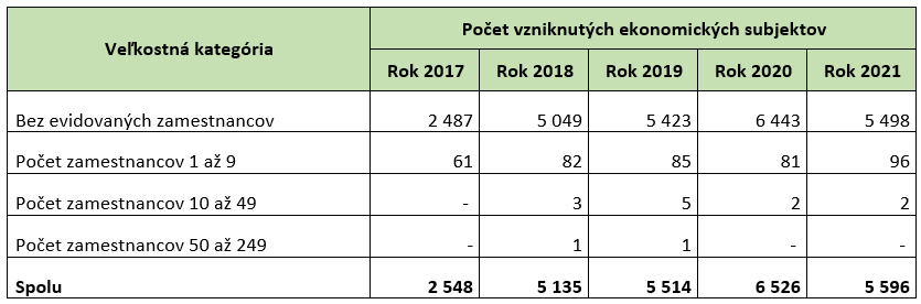 Z aspektu kombinácie časového (kalendárny rok) a veľkostného hľadiska (počet zamestnancov) vzniku ekonomických subjektov v období rokov 2017 až 2021 pribudlo v sektore najviac trhových aktérov v roku 2020 vo veľkostnej kategórii bez evidovaných zamestnancov, a to približne 6 440 ekonomických subjektov. Výrazný vznik ekonomických subjektov v tejto veľkostnej kategórii bol v rámci sektora zaznamenaný aj v roku 2021, a to približne 5 500 ekonomických subjektov. Naopak, najnižšou dynamikou sa vyznačovali roky 2017 a 2018.