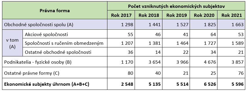 Z pohľadu kombinácie časového (kalendárny rok) a vecného hľadiska (právna forma) vzniku ekonomických subjektov v rokoch 2017 až 2021 vznikol najvyšší počet (a to cca 4 680 ekonomických subjektov) v roku 2020 prostredníctvom podnikateľov-fyzických osôb. Druhá najvyššia intenzita vzniku ekonomických subjektov (cca 3 970 ekonomických subjektov) v bankovníctve, finančných službách, poisťovníctve bola zaznamenaná v tejto právnej forme podnikania vo vlastnom mene a na vlastnú zodpovednosť v roku 2019. Obchodných spoločností vzniklo najviac v roku 2020 (cca 1 830 subjektov), z toho takmer všetky boli spoločnosti s ručením obmedzeným.