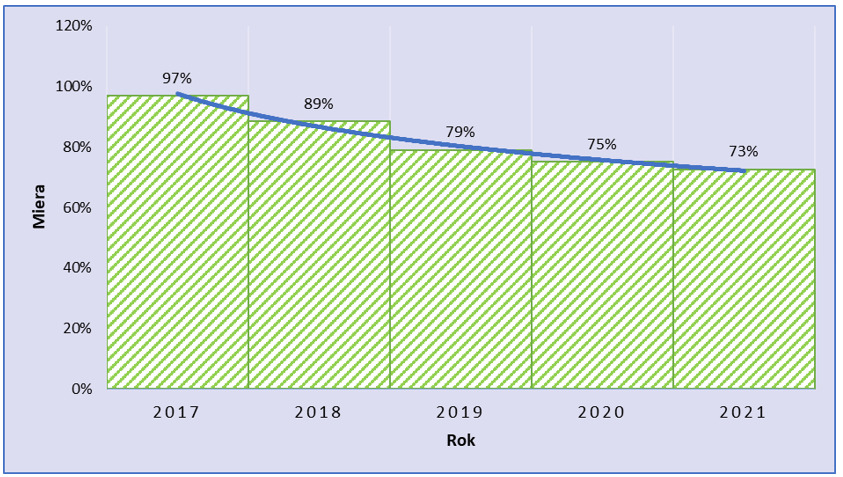 Zo všetkých ekonomických subjektov (t. j. 100 %), ktoré vznikli v sektore bankovníctvo, finančné služby, poisťovníctvo v roku 2017, ich približne 97 % pôsobilo na trhu aj ku koncu roku 2017, t. j. k 31. 12. 2017. Čiže približne 3 % ekonomických subjektov, ktoré vznikli v roku 2017, ukončilo svoju činnosť ešte do konca roku 2017 (rok 2017 bol súčasne rokom ich vzniku aj zániku). Z ekonomických subjektov, ktoré vznikli v sektore bankovníctvo, finančné služby, poisťovníctvo v roku 2017, ich naďalej aj ku koncu roku 2018, t. j. k 31. 12. 2018, pôsobilo približne 89 %. Ku koncu roku 2019 aj naďalej pôsobilo približne 79 % ekonomických subjektov, ktoré vznikli v sektore v roku 2017. Postupne miera prežitia ekonomických subjektov bola na úrovni 75 % v roku 2020 a 73 % v roku 2021. Na základe rozboru vývoja v náročnom období rokov 2017 až 2021 tak možno vyvodiť sektorovo špecifický záver, že zo 100 ekonomických subjektov vzniknutých v rámci sektora bankovníctvo, finančné služby, poisťovníctvo v roku 2017, ich 73 naďalej pôsobilo aj k 31. 12. 2021.