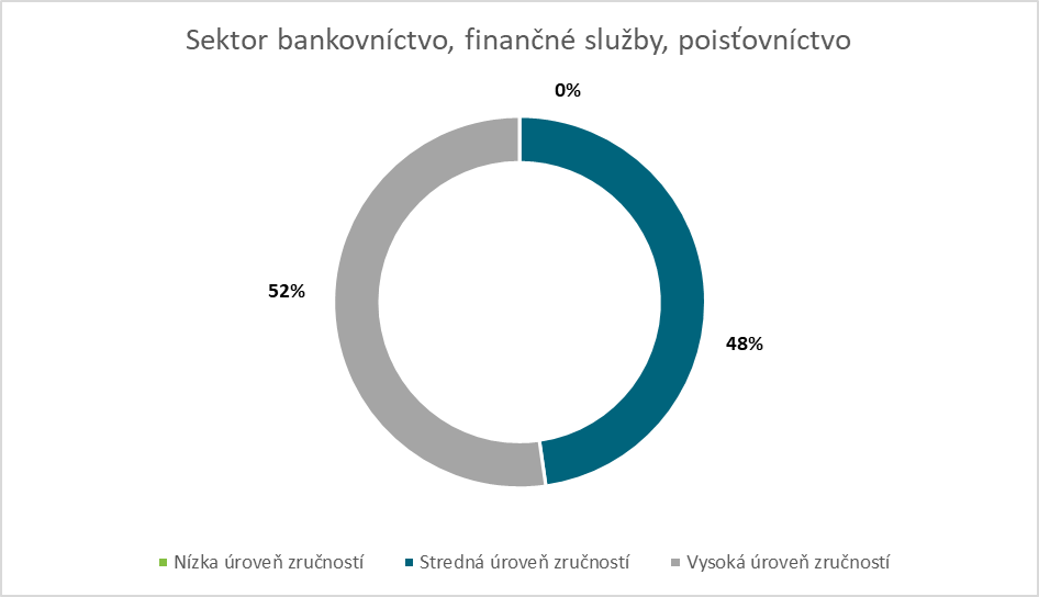 Na nízkej úrovni zručností sa nenachádzali nijakí zamestnanci, resp. UoZ s praxou v zamestnaniach garantovaných Sektorovou radou pre bankovníctvo, finančné služby, poisťovníctvo.