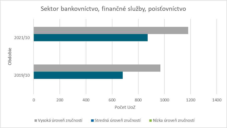 Sektorovo špecifickí UoZ s predchádzajúcou praxou na nízkej úrovni zručností sa v sektore bankovníctvo, finančné služby, poisťovníctvo nenachádzali, ako bolo uvedené vyššie, príslušná sektorová rada takéto zamestnania nemala v garancii. Sektorovo špecifickí zamestnanci v bankovníctve, finančných službách, poisťovníctve vykonávali v prevažnej miere pracovné činnosti vyžadujúce vysokú úroveň zručností a taktiež prevažujúci počet sektorovo špecifických UoZ vykonával bezprostredne pred zaradením do evidencie UoZ zamestnania, ktoré si vyžadovali túto zručnostnú úroveň. Z celkového počtu sektorovo špecifických UoZ ich bolo približne 58 %. Približne 42 % sektorovo špecifických UoZ vykonávalo pred ich zaradením do evidencie UoZ pracovné úlohy na strednej úrovni zručností. V sledovanom období od 31. 10. 2019 do 31. 10. 2021 sa v sektore bankovníctvo, finančné služby, poisťovníctvo počet sektorovo špecifických UoZ s predchádzajúcim zamestnaním na väčšinovej, t. j. na vysokej úrovni zručností, zvýšil približne o 210 osôb, t. j. o 22 %. Počet UoZ s predchádzajúcim zamestnaním na strednej úrovni zručností sa zvýšil približne o 190 osôb, t. j. o 28 % východiskového stavu.
