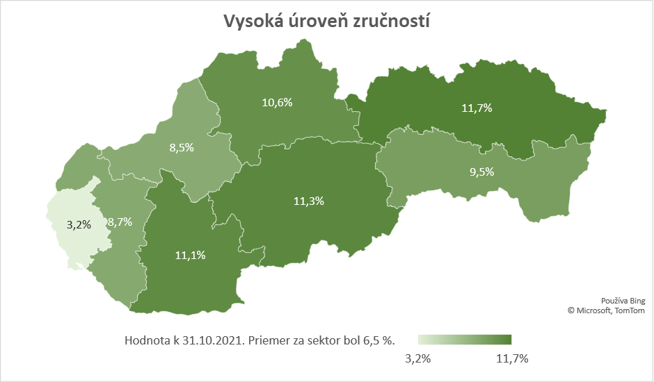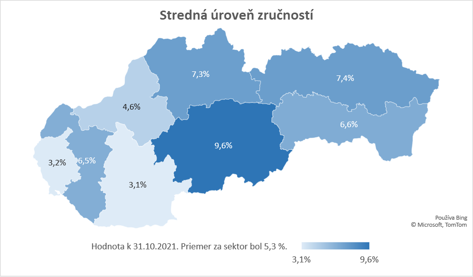 V prevažnej kategórii ľudských zdrojov, t. j. s vysokými zručnosťami, bola miera sektorovo špecifickej nezamestnanosti na úrovni 6,5 %, pretože z celkového počtu osôb, ktoré vykonávali sektorovo špecifické zamestnania s vysokou úrovňou zručností, či už aktuálne k 31. 10. 2021 alebo bezprostredne pred ich zaradením do evidencie UoZ, tvorili UoZ približne 6,5 %. V prípade strednej úrovne zručností bola miera sektorovo špecifickej nezamestnanosti k 31. 10. 2021 o niečo nižšia ako na vysokej úrovni, a to približne 5,3 %. V čase pandémie boli sektorovo špecifickou nezamestnanosťou výraznejšie zasiahnuté najmä Prešovský a Banskobystrický kraj, pričom situáciu v týchto krajoch ovplyvnil aj návrat do miesta trvalého pobytu u tých osôb, ktoré boli z výkonu prác sektorového charakteru uvoľnené v inom regióne, vrátane zahraničia. Na druhej strane celoštátny priemer znižoval Bratislavský kraj, ktorý zabezpečoval pracovné uplatnenie pre viac ako polovicu sektorovo špecifických ľudských zdrojov na vysokej úrovni zručností a približne štvrtinu na strednej úrovni zručností.