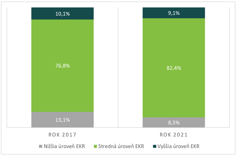 Počas uplynulých piatich rokov, t. j. medzi rokmi 2017 a 2021, najvýraznejšia zmena v štruktúre sektorovo špecifických zamestnancov nastala na strednej úrovni EKR, kde prišlo k zvýšeniu podielu sektorovo špecifických zamestnancov o cca 5,6 p. b. Na druhej strane, podiel zamestnancov s nižšou úrovňou EKR sa znížil o 4,6 p. b.