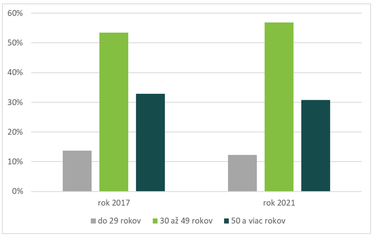 Podielovo najvýraznejšou skupinou zamestnancov v sektore celulózo-papierenský a polygrafický priemysel za rok 2021 boli zamestnanci vo veku 30 až 49 rokov. Ich podiel na celkovom počte sektorovo špecifických zamestnancov predstavoval cca 56,9 %, čo oproti roku 2017 predstavovalo zvýšenie o cca 3,4 p. b. Druhá najväčšia skupina zamestnancov tohto sektora bola vo vekovej skupine 50 a viac rokov, ich podiel mierne poklesol a v roku 2021 už predstavoval 30,8 %. Podiel najmladšej skupiny zamestnancov, t. j. do 29 rokov veku, bol najnižší. Zníženie medzi rokmi 2017 a 2021 dosiahlo 1,4 p. b., a to na konečných 12,3 %.