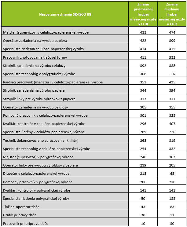 Z hľadiska zmeny mediánu hrubej mesačnej mzdy v peňažných jednotkách, t. j. v EUR, nastalo počas sledovaného obdobia v sektore celulózo-papierenský a polygrafický priemysel najvýraznejšie zvýšenie mzdy v zamestnaní Pracovník zhotovovania tlačovej formy, a to o 532 EUR. Za ním nasledovalo zamestnanie Majster (supervízor) v celulózo-papierenskej výrobe, kde zvýšenie medzi rokmi 2017 a 2021 predstavovalo 474 EUR. Mzdový nárast vo výške 425 EUR bol identifikovaný v sektorovo špecifickom zamestnaní Riadiaci pracovník (manažér) v celulózo-papierenskej výrobe. V zamestnaní Špecialista riadenia celulózo-papierenskej výroby išlo o 415 EUR.