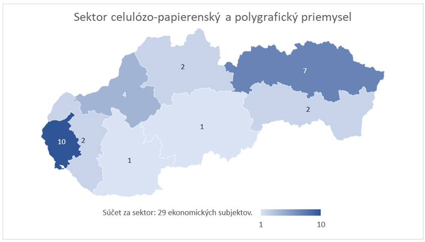 V priebehu ukončeného kalendárneho roku 2021 vzniklo v sektore celulózo-papierenský a polygrafický priemysel v rámci celej SR približne 30 ekonomických subjektov. Rozhodnutie o založení nového subjektu bolo koncentrované najmä v rámci Bratislavského a Prešovského kraja. Tieto dva regióny boli charakteristické približne 34 %-ným, resp. 24 %-ným zastúpením na celkovom počte ekonomických subjektov, ktoré vznikli v SR v sektore celulózo-papierenský a polygrafický priemysel v roku 2021. Medzi regiónmi najnižšie podiely na vzniku sektorovo špecifických ekonomických subjektov vykázali Nitriansky a Banskobystrický kraj, a to s minimálnou početnosťou novovzniknutých subjektov.