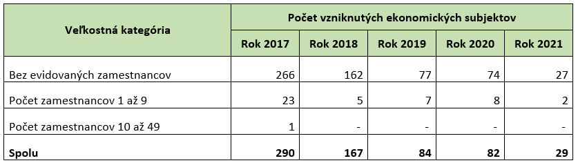 Z aspektu kombinácie časového (kalendárny rok) a veľkostného hľadiska (počet zamestnancov) vzniku ekonomických subjektov v období rokov 2017 až 2021 pribudlo v sektore najviac trhových aktérov na začiatku sledovaného obdobia, (t. j. v roku 2017) vo veľkostnej kategórii bez evidovaných zamestnancov, a to približne 270 ekonomických subjektov. Výrazný vznik ekonomických subjektov v tejto veľkostnej kategórii bol v rámci sektora zaznamenaný aj v roku 2018, a to cca 160 subjektov. Naopak, najnižšou dynamikou sa vyznačovali roky 2021 a 2020.