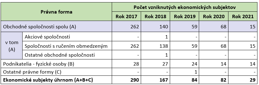 Z pohľadu kombinácie časového (kalendárny rok) a vecného hľadiska (právna forma) vzniku ekonomických subjektov v rokoch 2017 až 2021 vznikol najvyšší počet (a to až 260 ekonomických subjektov) v roku 2017 prostredníctvom obchodných spoločností, z toho takmer všetky boli spoločnosti s ručením obmedzeným. Druhá najvyššia intenzita vzniku nových ekonomických subjektov (približne 140 ekonomických subjektov) v celulózo-papierenskom a polygrafickom priemysle bola zaznamenaná v tejto právnej forme podnikania taktiež v roku 2018. Podnikateľov-fyzických osôb vzniklo najviac v roku 2017, a to cca 30 subjektov.
