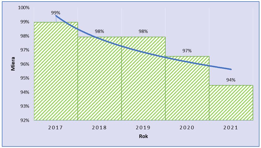 Zo všetkých ekonomických subjektov (t. j. 100 %), ktoré vznikli v sektore celulózo-papierenský a polygrafický priemysel v roku 2017, ich približne 99 % pôsobilo na trhu aj ku koncu roku 2017, t. j. k 31. 12. 2017. Čiže približne 1 % ekonomických subjektov, ktoré vznikli v roku 2017, ukončilo svoju činnosť ešte do konca roku 2017 (rok 2017 bol súčasne rokom ich vzniku aj zániku). Z ekonomických subjektov, ktoré vznikli v sektore celulózo-papierenský a polygrafický priemysel v roku 2017, ich naďalej aj ku koncu roku 2018, t. j. k 31. 12. 2018, pôsobilo približne 98 %. Taktiež ku koncu roku 2019 aj naďalej pôsobilo približne 98 % ekonomických subjektov, ktoré vznikli v sektore v roku 2017. Postupne miera prežitia ekonomických subjektov bola na úrovni 97 % v roku 2020 a 94 % v roku 2021. Na základe rozboru vývoja v náročnom období rokov 2017 až 2021 tak možno vyvodiť sektorovo špecifický záver, že zo 100 ekonomických subjektov vzniknutých v rámci sektora celulózo-papierenský a polygrafický priemysel v roku 2017, ich 94 naďalej pôsobilo aj k 31. 12. 2021.