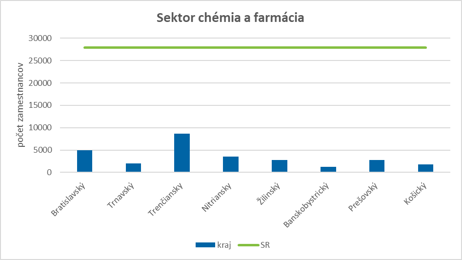 Sektor chémia a farmácia bol charakteristický približne 30 %-ným (viac ako 8 700 osôb) zastúpením Trenčianskeho kraja na celkovom počte sektorovo špecifických zamestnancov v SR a takmer 20 % (viac ako 5 000 osôb) sektorovo špecifických pracovných príležitostí sa využilo v Bratislavskom kraji. Medzi regiónmi najnižší podiel sektorovo špecifických zamestnancov vykázal k 31. 12. 2021 Banskobystrický kraj, a to necelých 5 % z úhrnného počtu sektorovo špecifických zamestnancov.