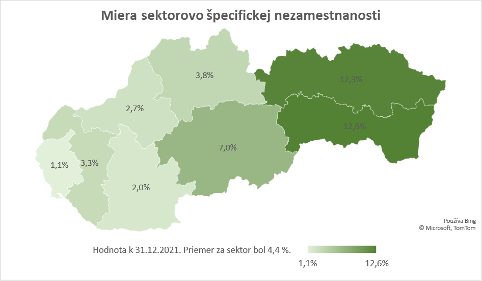 Miera sektorovo špecifickej nezamestnanosti bola v troch krajoch SR vyššia, ako bola jej celoštátna priemerná hodnota v rámci sektora, pričom situáciu v krajoch ovplyvnila taktiež návratová mobilita osôb, ktoré boli z práce uvoľnené v inom regióne, vrátane zahraničia. V sektore chémia a farmácia bola najvýraznejšia miera sektorovo špecifickej nezamestnanosti k 31. 12. 2021 zaznamenaná v Košickom kraji a v Prešovskom kraji, kde dosiahla približne 12 %. V opačnom spektre sa nachádzal Bratislavský kraj, kde bola minimálna miera sektorovo špecifickej nezamestnanosti, a to iba cca 1 %. Podobne nízka hodnota sledovaného ukazovateľa bola aj v Nitrianskom kraji, a to cca 2 %.