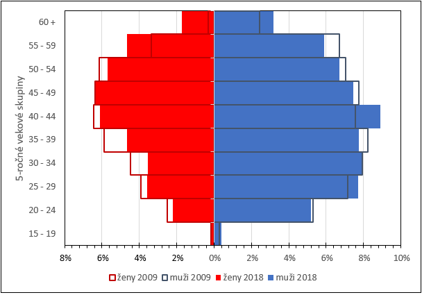 Porovnanie vekovej pyramídy mužov a žien zamestnaných v rámci sektora chémia a farmácia za roky 2009 a 2018