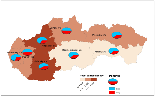 Zamestnanosť v sektore chémia a farmácia v členení podľa celkového počtu zamestnancov a pohlavia podľa samosprávnych krajov v SR za rok 2018