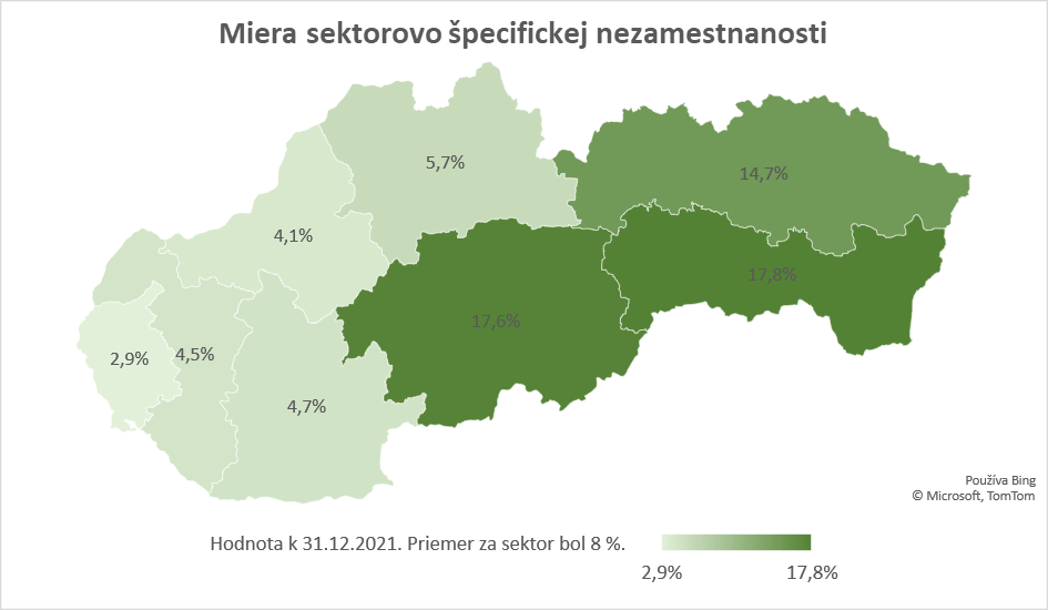 Miera sektorovo špecifickej nezamestnanosti bola v troch krajoch SR vyššia, ako bola jej celoštátna priemerná hodnota v rámci sektora, pričom situáciu v krajoch ovplyvnila taktiež návratová mobilita osôb, ktoré boli z práce uvoľnené v inom regióne, vrátane zahraničia. V sektore elektrotechnika bola najvýraznejšia miera sektorovo špecifickej nezamestnanosti k 31. 12. 2021 zaznamenaná v Košickom, ako aj v Banskobystrickom kraji, kde dosiahla takmer 18 %. V opačnom spektre vynikal Bratislavský kraj, kde bola zaznamenaná miera sektorovo špecifickej nezamestnanosti iba na úrovni cca 3 %.