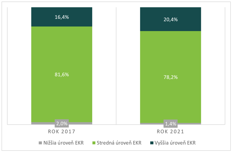 Následne, t. j. v roku 2021, bol podiel zamestnancov s nižšou úrovňou EKR cca 1,4 % z celkového počtu sektorovo špecifických zamestnancov. Stredná úroveň EKR bola v tomto roku evidovaná u 78,2 % zamestnancov z daného sektora. Zamestnanci disponujúci najvyššími zručnosťami a kompetenciami, t. j. tí s vyššou úrovňou EKR, v tomto roku predstavovali cca 20,4 %-ný podiel na celkovom počte sektorovo špecifických zamestnancov.