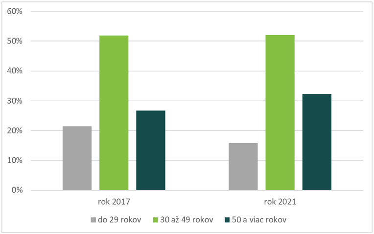 Podielovo najvýraznejšou skupinou zamestnancov v sektore elektrotechnika za rok 2021 boli zamestnanci vo veku 30 až 49 rokov. Ich podiel na celkovom počte sektorovo špecifických zamestnancov predstavoval cca 52 % (približne rovnako ako v roku 2017). Druhá najväčšia skupina zamestnancov tohto sektora bola vo vekovej skupine 50 a viac rokov, ich podiel bol rastúci a v roku 2021 predstavoval 32,2 %. Podiel najmladšej skupiny zamestnancov, t. j. do 29 rokov veku, bol najnižší. Zníženie medzi rokmi 2017 a 2021 dosiahlo 5,6 p. b., a to na konečných 15,8 %.