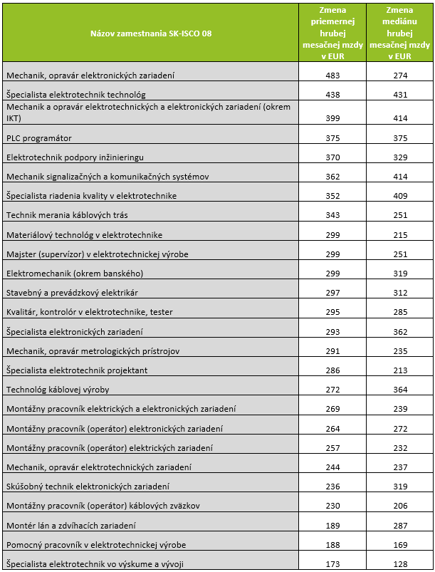 Z hľadiska zmeny priemernej hrubej mesačnej mzdy v peňažných jednotkách, t. j. v EUR, bola v rozmedzí rokov 2017 a 2021 spomedzi sektorovo špecifických zamestnaní identifikovaná najvyššia zmena na úrovni 483 EUR v zamestnaní Mechanik, opravár elektronických zariadení. Druhé najvyššie zvýšenie miezd v sektore elektrotechnika bolo medzi rokmi 2017 a 2021 zaznamenané v prípade zamestnania Špecialista elektrotechnik technológ, kde príslušný nárast predstavoval 438 EUR. Na treťom mieste boli zamestnanci evidovaní v zamestnaní Mechanik a opravár elektrotechnických a elektronických zariadení (okrem IKT), a to so zvýšením mzdy v priemere o 399 EUR. Výrazné zvýšenie miezd v rámci sektora bolo aj pri zamestnaniach PLC programátor (o 375 EUR) a Elektrotechnik podpory inžinieringu (o 370 EUR).
