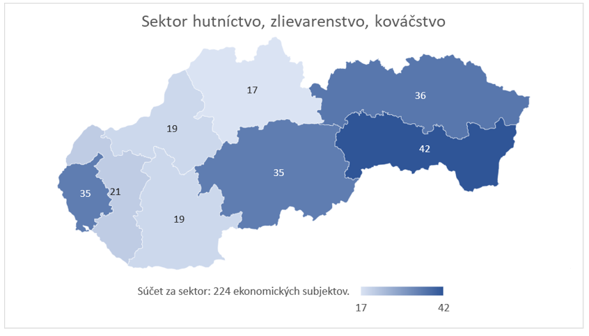 V priebehu ukončeného kalendárneho roku 2021 vzniklo v sektore hutníctvo, zlievarenstvo, kováčstvo v rámci celej SR približne 220 ekonomických subjektov. Rozhodnutie o založení nového subjektu bolo koncentrované najmä v rámci Košického, Prešovského a Banskobystrického kraja. Tieto regióny boli charakteristické približne 19 %-ným, resp. cca 16 %-ným zastúpením na celkovom počte ekonomických subjektov, ktoré vznikli v SR v sektore hutníctvo, zlievarenstvo, kováčstvo v roku 2021. Medzi regiónmi najnižšie podiely na vzniku sektorovo špecifických ekonomických subjektov vykázali Žilinský, Nitriansky a Trenčiansky kraj, a to s početnosťou približne 20 novovzniknutých subjektov.