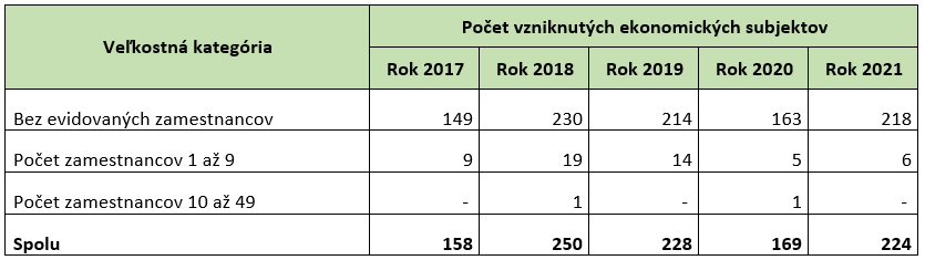 Z aspektu kombinácie časového (kalendárny rok) a veľkostného hľadiska (počet zamestnancov) vzniku ekonomických subjektov v období rokov 2017 až 2021 pribudlo v sektore najviac trhových aktérov v roku 2018 vo veľkostnej kategórii bez evidovaných zamestnancov, a to 230 ekonomických subjektov. Výrazný vznik ekonomických subjektov v tejto veľkostnej kategórii bol v rámci sektora zaznamenaný aj v roku 2021, a to približne 220 ekonomických subjektov. Naopak, najnižšou dynamikou sa vyznačovali roky 2017 a 2020.