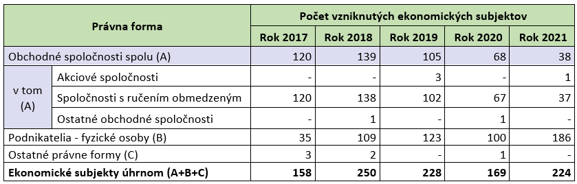 Z pohľadu kombinácie časového (kalendárny rok) a vecného hľadiska (právna forma) vzniku ekonomických subjektov v rokoch 2017 až 2021 vznikol najvyšší počet (a to až 190 ekonomických subjektov) v roku 2021 prostredníctvom podnikateľov-fyzických osôb. Mierne nižšia intenzita vzniku ekonomických subjektov (cca 120 ekonomických subjektov) v hutníctve, zlievarenstve, kováčstve bola zaznamenaná v tejto právnej forme podnikania vo vlastnom mene a na vlastnú zodpovednosť v roku 2019. Obchodných spoločností vzniklo najviac v roku 2018 (a to cca 140 subjektov), z toho takmer všetky boli spoločnosti s ručením obmedzeným.