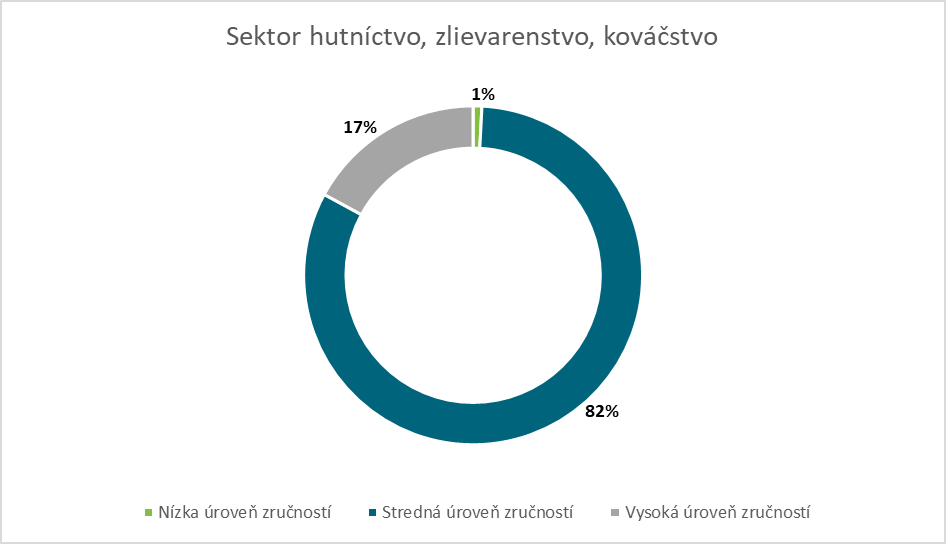 Sektor hutníctvo, zlievarenstvo, kováčstvo sa vyznačoval približne 82 %-ným zastúpením zamestnancov s pracovnými činnosťami na strednej úrovni zručností z celkového počtu sektorovo špecifických zamestnancov, pričom táto zručnostná kategória predstavovala aj najpočetnejšiu časť sektorovo špecifických UoZ. K 31. 10. 2021 tvorili osoby s predchádzajúcimi pracovnými úlohami na strednej úrovni zručností približne 75 % z celkového počtu sektorovo špecifických UoZ. Necelých 15 % sektorovo špecifických UoZ vykonávalo pred ich zaradením do evidencie UoZ pracovné úlohy na nízkej úrovni zručností a najmenej sektorovo špecifických UoZ bolo s predchádzajúcou praxou na vysokej úrovni zručností (cca 10 %). Vývoj v sektore v období od 31. 10. 2019 do 31. 10. 2021 v rozhodujúcej miere ovplyvňovali Košický a Banskobystrický kraj, kde boli koncentrované približne dve tretiny sektorovo špecifických pracovných činností v úhrne za všetky úrovne zručností. Na vysokej úrovni zručností sa počet sektorovo špecifických UoZ v sledovanom období znížil, naopak, na strednej a nízkej úrovni zručností sa zvýšil. Bližšie informácie sú nasledovné:
