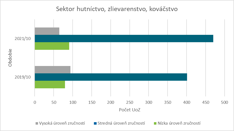 V sledovanom období od 31. 10. 2019 do 31. 10. 2021 sa v sektore hutníctvo, zlievarenstvo, kováčstvo počet sektorovo špecifických UoZ s predchádzajúcim zamestnaním na prevažnej, t. j. na strednej úrovni zručností, zvýšil približne o 70 osôb, čo je viac ako o 17 %. Vysoká zručnostná úroveň zaznamenala v sledovanom období zníženie počtu sektorovo špecifických UoZ o 30 osôb, čo vzhľadom k nízkej početnosti UoZ s praxou na vysokej úrovni zručností predstavovalo ich relatívny úbytok viac ako o 30 % východiskového stavu. V prípade sektorovo špecifických UoZ s praxou na nízkej úrovni zručností pribudla v evidencii UoZ jedna desiatka osôb, t. j. 14 % počtu z obdobia pred 24 mesiacmi.