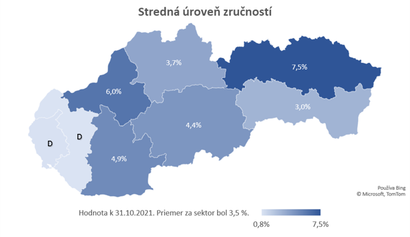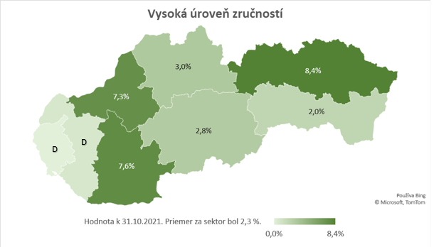 Miera sektorovo špecifickej nezamestnanosti na strednej úrovni zručností v sektore hutníctvo, zlievarenstvo, kováčstvo v regionálnom členení podľa krajov v SR k 31. 10. 2021