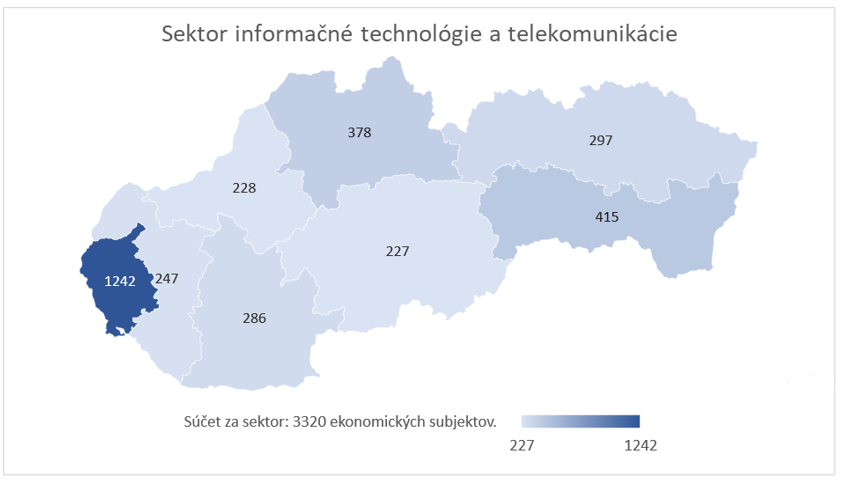 V priebehu ukončeného kalendárneho roku 2021 vzniklo v sektore informačné technológie a telekomunikácie v rámci celej SR približne 3 320 ekonomických subjektov. Rozhodnutie o založení nového subjektu bolo koncentrované najmä v rámci Bratislavského a Košického kraja. Tieto dva regióny boli charakteristické približne 37 %-ným, resp. 13 %-ným zastúpením na celkovom počte ekonomických subjektov, ktoré vznikli v SR v sektore informačné technológie a telekomunikácie v roku 2021. Medzi regiónmi najnižšie podiely na dynamike vzniku sektorovo špecifických ekonomických subjektov vykázali Banskobystrický a Trenčiansky kraj, a to s početnosťou približne 230 novovzniknutých subjektov.