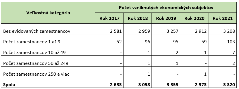 Ekonomické subjekty, ktoré začali pôsobiť v sektore informačné technológie a telekomunikácie v sledovanom časovom intervale, boli prevažne bez evidovaných zamestnancov, pričom kumulatívne v období od roku 2017 do roku 2021 v tejto veľkostnej kategórii začalo svoju činnosť približne 14 920 ekonomických subjektov. Približne 410 ekonomických subjektov vzniklo v rámci sektora vo veľkostnej kategórii 1 až 9 zamestnancov a v kategórii 10 až 49 zamestnancov to bolo približne 10 nových ekonomických subjektov. Vo veľkostnej kategórii 50 až 249 zamestnancov od roku 2017 do roku 2021 vznikli v sektore štyri nové ekonomické subjekty a vo veľkostnej kategórii 250 a viac zamestnancov to boli dva nové ekonomické subjekty. V priemere počas sledovaného obdobia vzniklo v sektore, bez ohľadu na veľkostnú kategóriu, približne 3 070 ekonomických subjektov ročne.