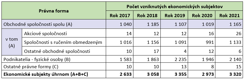 Z pohľadu kombinácie časového (kalendárny rok) a vecného hľadiska (právna forma) vzniku ekonomických subjektov v rokoch 2017 až 2021 vznikol najvyšší počet (a to cca 2 240 ekonomických subjektov) v roku 2019 prostredníctvom podnikateľov-fyzických osôb. Približne rovnaká intenzita vzniku ekonomických subjektov v informačných technológiách a telekomunikácii bola zaznamenaná v tejto právnej forme podnikania vo vlastnom mene a na vlastnú zodpovednosť taktiež v roku 2021. Obchodných spoločností vzniklo najviac v roku 2018 (a to 1 190 subjektov), z toho takmer všetky boli spoločnosti s ručením obmedzeným.