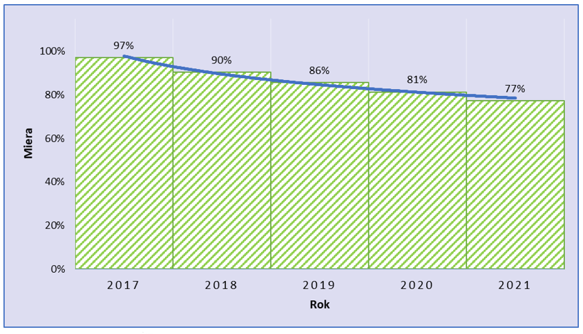 Zo všetkých ekonomických subjektov (t. j. 100 %), ktoré vznikli v sektore informačné technológie a telekomunikácie v roku 2017, ich približne 97 % pôsobilo na trhu aj ku koncu roku 2017, t. j. k 31. 12. 2017. Čiže približne 3 % ekonomických subjektov, ktoré vznikli v roku 2017, ukončilo svoju činnosť ešte do konca roku 2017 (rok 2017 bol súčasne rokom ich vzniku aj zániku). Z ekonomických subjektov, ktoré vznikli v sektore informačné technológie a telekomunikácie v roku 2017, ich naďalej aj ku koncu roku 2018, t. j. k 31. 12. 2018, pôsobilo približne 90 %. Ku koncu roku 2019 aj naďalej pôsobilo približne 86 % ekonomických subjektov, ktoré vznikli v sektore v roku 2017. Postupne miera prežitia ekonomických subjektov bola na úrovni 81 % v roku 2020 a 77 % v roku 2021. Na základe rozboru vývoja v náročnom období rokov 2017 až 2021 tak možno vyvodiť sektorovo špecifický záver, že zo 100 ekonomických subjektov vzniknutých v rámci sektora informačné technológie a telekomunikácie v roku 2017, ich 77 naďalej pôsobilo aj k 31. 12. 2021.