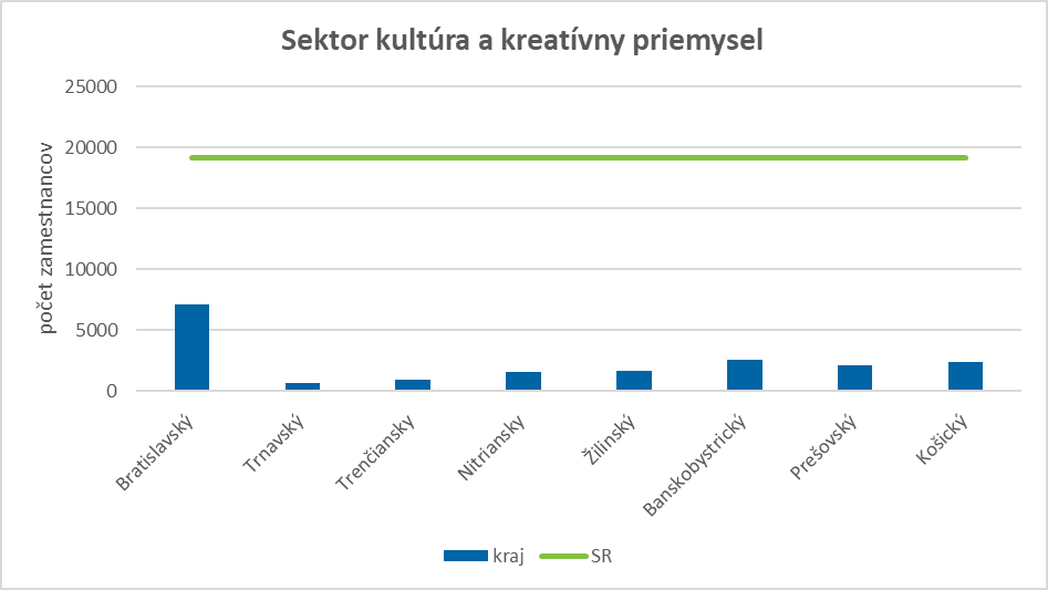 Sektor kultúra a kreatívny priemysel bol k 31. 12. 2021 charakteristický približne 37 %-ným (viac ako 7 000 osôb) zastúpením metropolitného regiónu, t. j. Bratislavského kraja, na celkovom počte sektorovo špecifických zamestnancov v SR. Viac ako 10 %-né podiely pripadali na Banskobystrický, Košický a Prešovský kraj. Medzi regiónmi SR najnižší podiel sektorovo špecifických zamestnancov vykázal Trnavský kraj, a to približne 4 % z úhrnného počtu sektorovo špecifických zamestnancov v kultúre a kreatívnom priemysle.