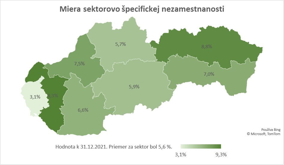 Bratislavský kraj, ktorý v rámci SR predstavoval kľúčový kultúrno-kreatívny región, v sledovanom období výrazne determinoval taktiež celoštátnu mieru sektorovo špecifickej nezamestnanosti. Práve v Bratislavskom kraji bola k 31. 12. 2021 zaznamenaná najnižšia hodnota miery sektorovo špecifickej nezamestnanosti, a to na úrovni približne 3 %. Ďalšie kraje zaznamenali vyššie hodnoty, ako bol celoštátny priemer v rámci sektora (cca 6 %), pričom situáciu v krajoch ovplyvnila taktiež návratová mobilita osôb, ktoré boli z práce uvoľnené v inom regióne, vrátane zahraničia. Najvýraznejšia miera sektorovo špecifickej nezamestnanosti bola k 31. 12. 2021 zaznamenaná v Trnavskom, resp. Prešovskom kraji, a to približne 9 %.