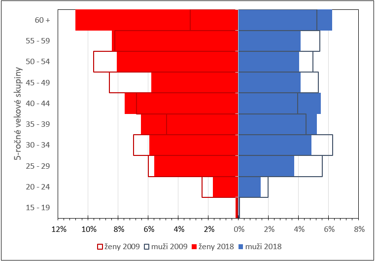 Porovnanie vekovej pyramídy mužov a žien zamestnaných v rámci sektora kultúra a vydavateľstvo za roky 2009 a 2018