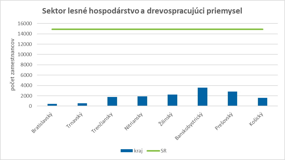 Sektor bol charakteristický približne 24 %-ným (viac ako 3 500 osôb) zastúpením Banskobystrického kraja na celkovom počte sektorovo špecifických zamestnancov v SR. Takmer 19 % (viac ako 2 800 osôb) sektorovo špecifických pracovných príležitostí sa využilo v Prešovskom kraji. Medzi regiónmi najnižší podiel sektorovo špecifických zamestnancov vykázal k 31. 12. 2021 Bratislavský kraj, a to necelé 3 % z úhrnného počtu sektorovo špecifických zamestnancov v lesnom hospodárstve a drevospracujúcom priemysle v rámci SR.