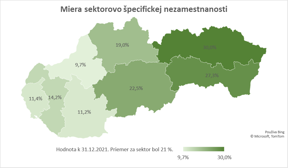 Miera sektorovo špecifickej nezamestnanosti bola v troch krajoch SR vyššia, ako bola jej celoštátna priemerná hodnota v rámci sektora, pričom situáciu v krajoch ovplyvnila taktiež návratová mobilita osôb, ktoré boli z práce uvoľnené v inom regióne, vrátane zahraničia. V sektore lesné hospodárstvo a drevospracujúci priemysel bola najvýraznejšia miera sektorovo špecifickej nezamestnanosti k 31. 12. 2021 zaznamenaná v Prešovskom kraji, kde dosiahla približne 30 %. Jej druhá najvyššia hodnota bola v Košickom kraji, a to cca 27 %. V opačnom spektre sa nachádzal Trenčiansky kraj, kde bola najnižšia miera sektorovo špecifickej nezamestnanosti, a to cca 10 %. Nízka hodnota sledovaného ukazovateľa bola aj v Nitrianskom a Bratislavskom kraji, a to cca 11 %.