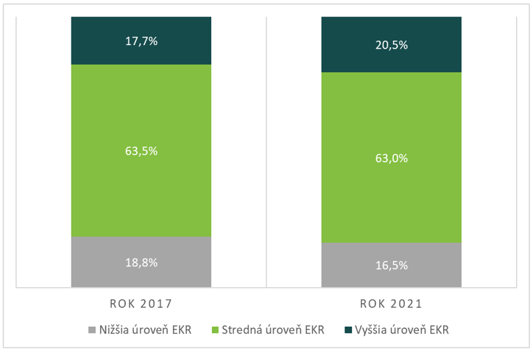Počas uplynulých piatich rokov, t. j. medzi rokmi 2017 a 2021, najvýraznejšia zmena v štruktúre sektorovo špecifických zamestnancov nastala na vyššej úrovni EKR, kde prišlo k zvýšeniu podielu sektorovo špecifických zamestnancov o cca 2,8 p. b. Na druhej strane, podiel zamestnancov s nižšou úrovňou EKR sa znížil o 2,3 p. b.