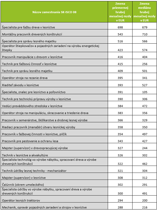 Z hľadiska zmeny mediánu hrubej mesačnej mzdy v peňažných jednotkách, t. j. v EUR, nastalo počas sledovaného obdobia v sektore lesné hospodárstvo a drevospracujúci priemysel najvýraznejšie zvýšenie mzdy v zamestnaní Montážny pracovník drevených konštrukcií, a to o 710 EUR. Za ním nasledovalo zamestnanie Špecialista pre ťažbu dreva v lesníctve, kde zvýšenie medzi rokmi 2017 a 2021 predstavovalo 679 EUR. Mzdový nárast vo výške 574 EUR bol identifikovaný v sektorovo špecifickom zamestnaní Operátor štiepkovačov a pojazdných zariadení na výrobu energetickej štiepky. V zamestnaní Špecialista pre správu lesného majetku išlo o 566 EUR.